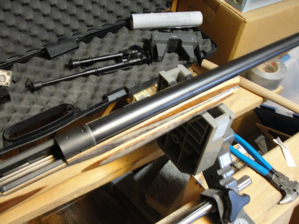 This fat pipe doesn’t fit into the stock due to it’s large diameter so I had to channel it out to fit. I used some dowels with 120 grit sandpaper to do the work. I sanded, test fit, sanded, test fit, over and over for about 9 total hours. I had to be careful not to just hog out a straight channel, I made it match the taper of the barrel so there are no gaps or tight spots.
